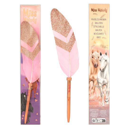 The refined design of this ballpoint pen with a feather decoration in the popular Miss Melody brand design creates not only a practical writing instrument, but also an exclusive stylish accessory. The feather is decorated with glitter.